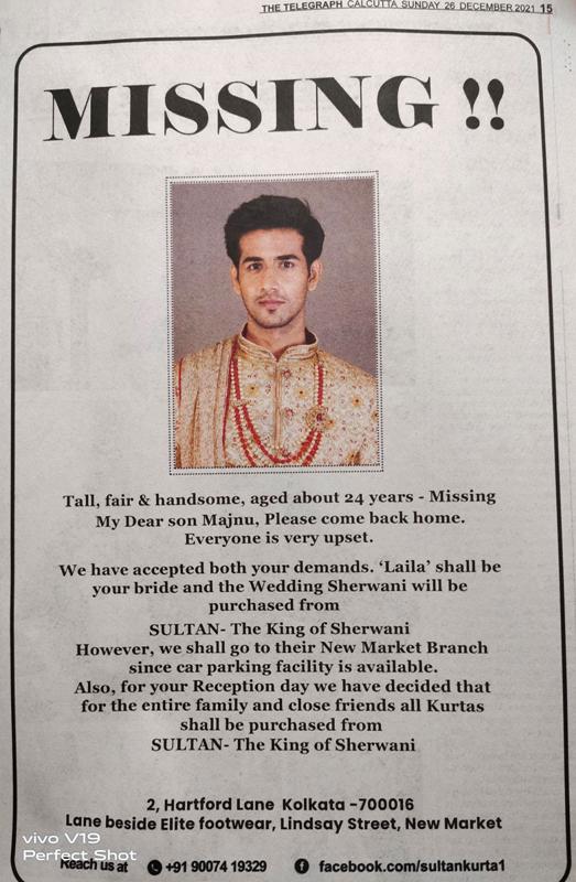The ad read, “Tall, fair & handsome, aged about 24 years- Missing my dear son Majnu, please come home, everyone is very upset. We have accepted both your demands. ‘Laila’ shall be your bride and the wedding sherwani will be purchased from Sultan – The King of Sherwani. However, we shall go to their New Market branch since a car parking facility is available.”