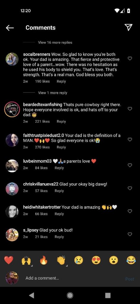An Instagram user expressed feelings of most viewers astutely and wrote, “Wow. So glad to know you’re both ok. Your dad is amazing. That fierce and protective love of a parent…wow. There was no hesitation as he used his body to shield you. That’s love. That’s strength. That’s a real man. God bless you both.”